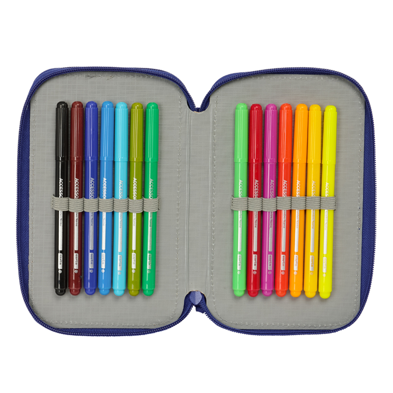 Školský dvojposchodový plný peračník. Obsah: farebné fixky, pastelky, ceruzka, pero, guma, strúhadlo. Rozmery: 12,5x19,5x4 cm