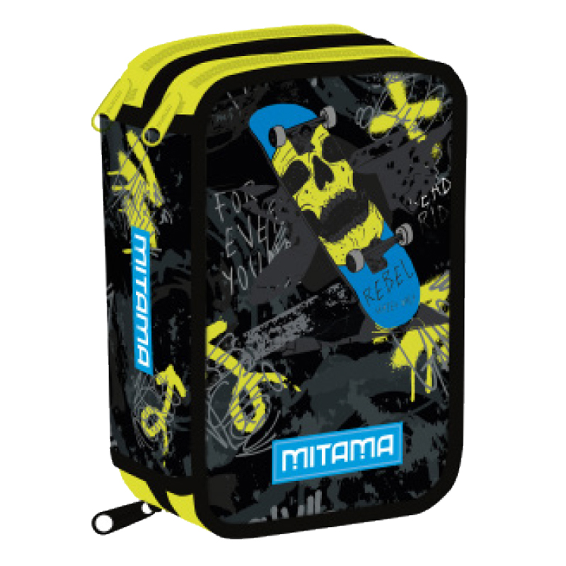 Detský školský trojposchodový peračník s bohatou výbavou a s gumovými úchytmi na ceruzky a perá, gumu od talianskej značky MITAMA. Obsah peračníka: 2x guličkové pero FLUO, 2x gumovateľné pero Spinny(modré,červené),2x guličkové pero(modré,čierne) 1x tyčinkové lepidlo, 2x ceruzka HB, 1x guma FLOU, 1x strúhadlo FLUO, 1x pravítko FLUO 15cm, 18x farebné pastelky trojhranné, 18x supervyprateľné trojhranné fixky. Rozmer: 20x14x7 cm