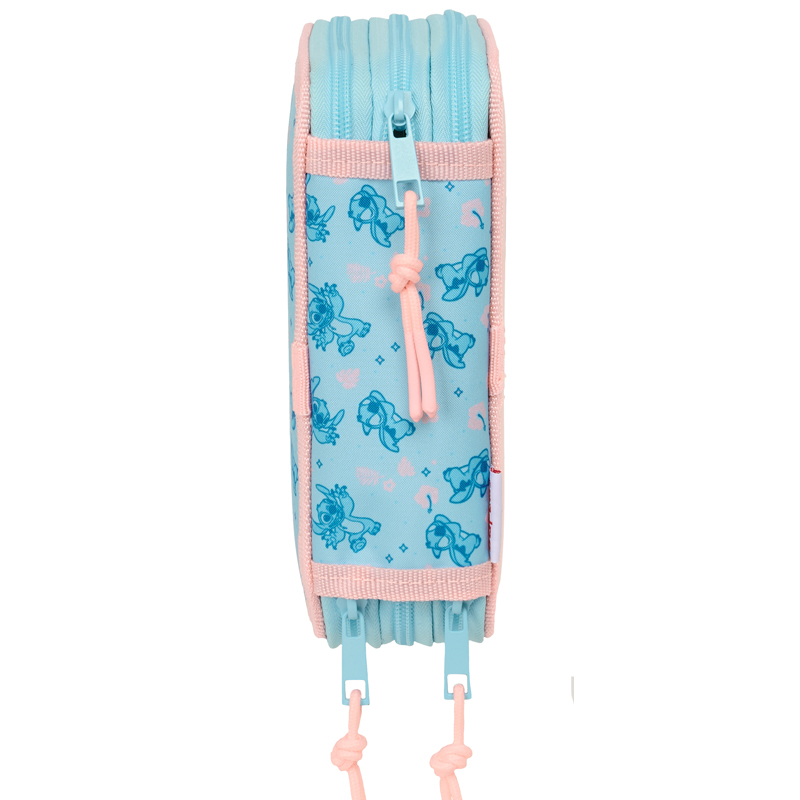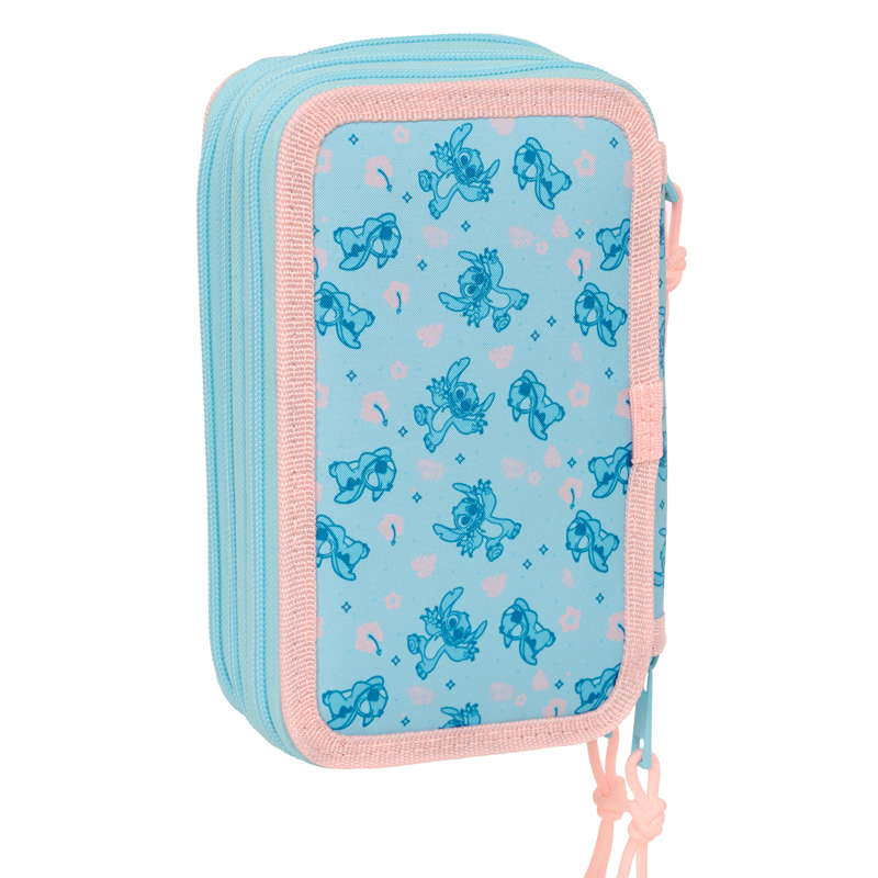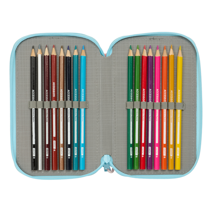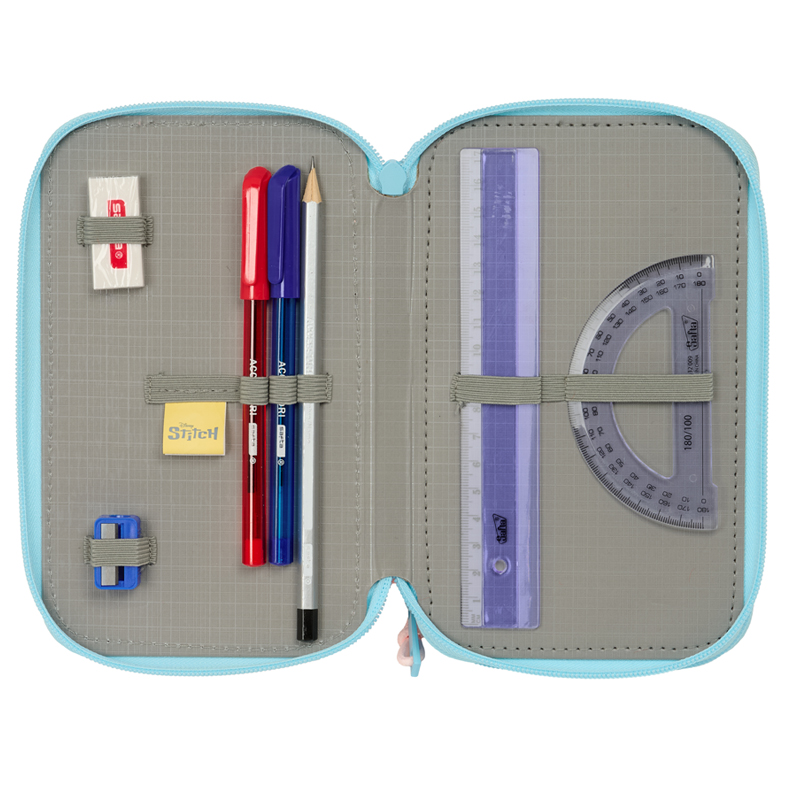 Školský trojposchodový plný peračník. Obsahuje 37 dielikov: gumu, grafitovú ceruzku, modro-červené pero, strúhadlo, ryté modré pravítko a polkruh (1. priehradka), 16 drevených farbičiek (2. priehradka), 14 farebných fixiek (3. priehradka). Rozmery: 12,5x19,5x5,5 cm