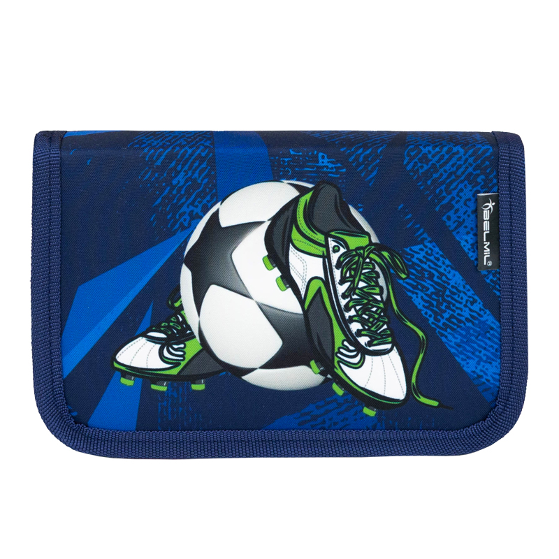 Prázdny jednoduchý peračník s jednou klopou,s gumovými úchytmi na ceruzky a perá, vreckom na suchý zips vhodným na peniaze, gumu a prepážkou s priehľadnou fóliou a rozvrhom hodín.