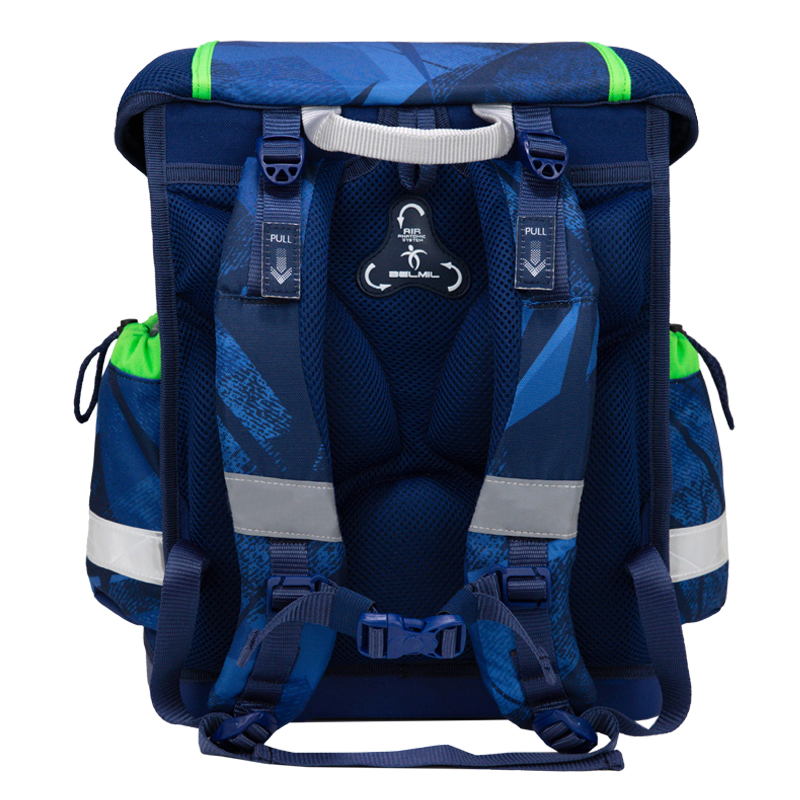 Školská taška váži iba 1 kg. Lisovaná chrbtová časť tašky je anatomicky tvarovaná. Taška má tiež špeciálny sieťovaný materiál pre maximálne vetranie na chrbte a nastaviteľné popruhy na ramená so silným polstrovaním pre pohodlné nosenie. Spolu s ergonomicky tvarovanými popruhmi, ktoré sa dajú utiahnuť v hornej aj spodnej časti, zaistia správne nosenie na chrbte školáka aj pri dennom náklade niekoľkých kíl učenia. Na taške sa nachádza hrudný popruh. Okrem toho, taška Belmil je výrazná tým, že zahŕňa zosilnené dno ruksaku s nožičkami pre stabilitu pri postavení na zem.