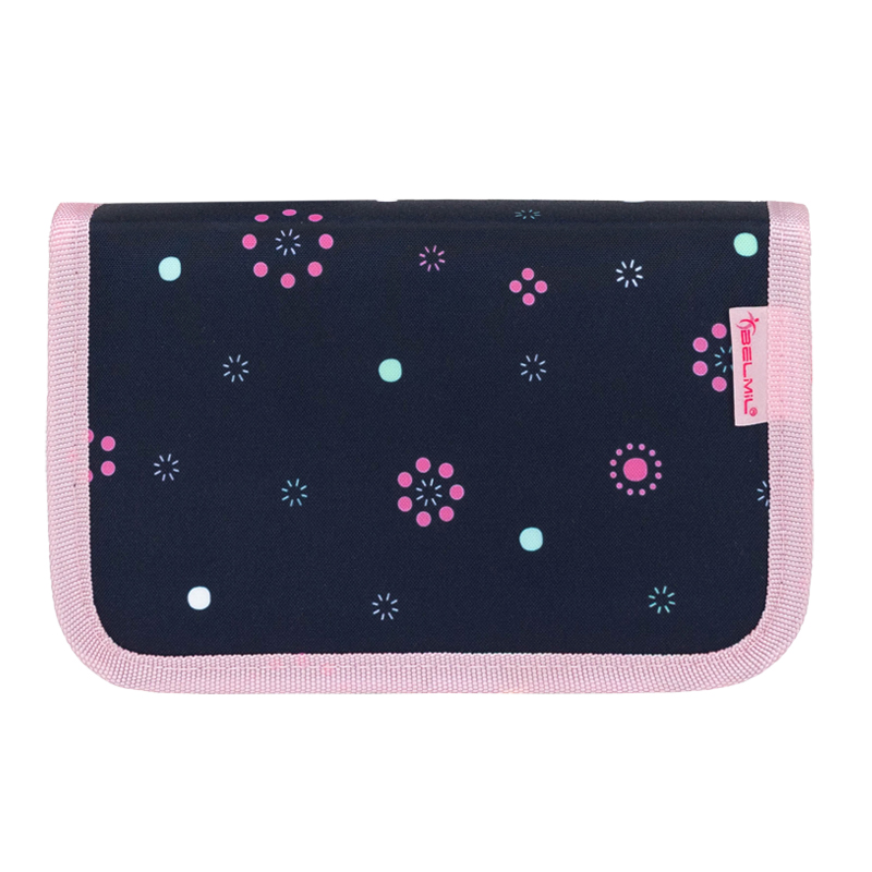 Prázdny jednoduchý peračník s jednou klopou,s gumovými úchytmi na ceruzky a perá, vreckom na suchý zips vhodným na peniaze, gumu a prepážkou s priehľadnou fóliou a rozvrhom hodín.