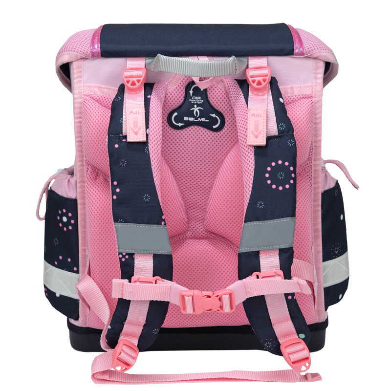Školská taška váži iba 1 kg. Lisovaná chrbtová časť tašky je anatomicky tvarovaná. Taška má tiež špeciálny sieťovaný materiál pre maximálne vetranie na chrbte a nastaviteľné popruhy na ramená so silným polstrovaním pre pohodlné nosenie. Spolu s ergonomicky tvarovanými popruhmi, ktoré sa dajú utiahnuť v hornej aj spodnej časti, zaistia správne nosenie na chrbte školáka aj pri dennom náklade niekoľkých kíl učenia. Na taške sa nachádza hrudný popruh. Okrem toho, taška Belmil je výrazná tým, že zahŕňa zosilnené dno ruksaku s nožičkami pre stabilitu pri postavení na zem.