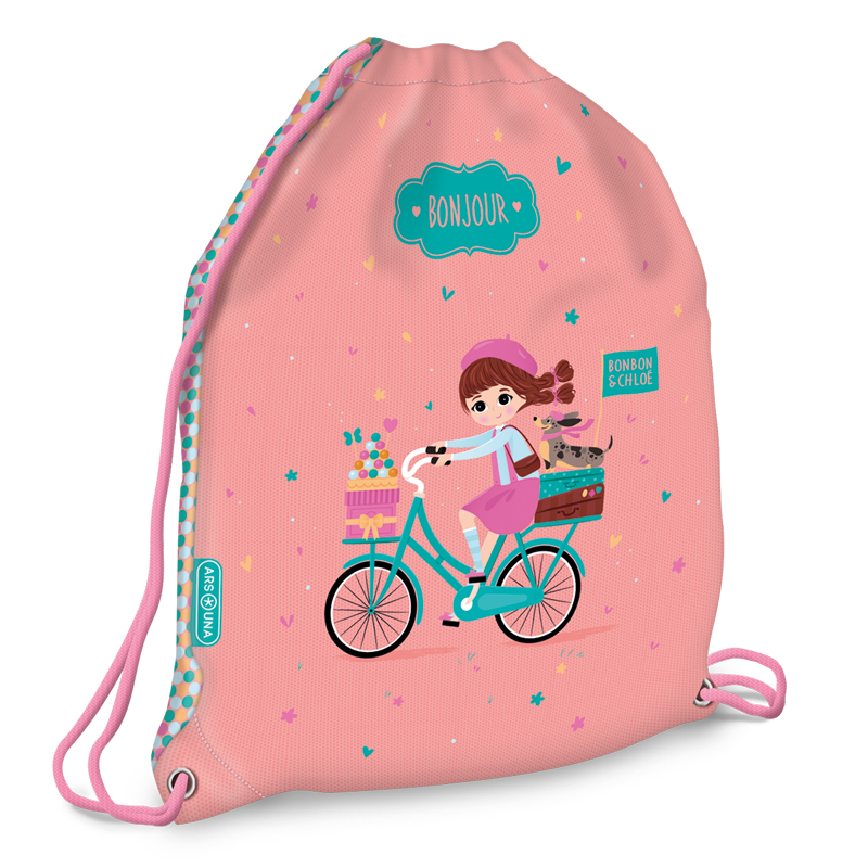 Vrecko sa sťahuje pomocou šnúrok, ktoré vedú cez celú zadnú časť a dá sa nosiť na chrbte alebo na ramene. Je vhodné na prezuvky alebo aj na oblečenie na telesnú výchovu alebo na každodenné nosenie. Rozmer: 32x42 cm.